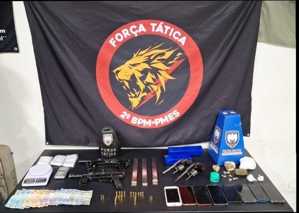 O que chamou a atenção dos policiais foi o poder de fogo dos criminosos: entre as quatro armas apreendidas, estavam duas submetralhadoras. Além do armamento pesado, os militares encontraram 23 munições intactas, uma carga expressiva de drogas, aparelhos celulares e uma grande quantia em dinheiro em espécie.