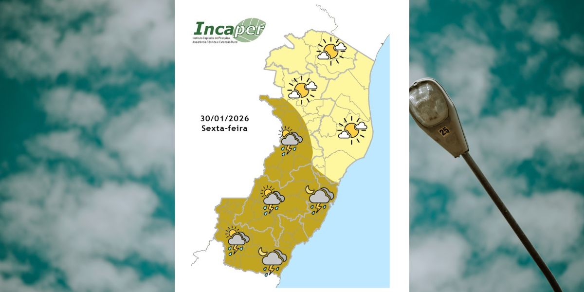 Nesta sexta-feira (30), o tempo permanece aberto até o fim da manhã em todo o Espírito Santo. A partir da tarde, a aproximação de uma frente fria provoca pancadas de chuva com trovoadas nas regiões Sul, Serrana e em parte da Região Noroeste, avançando à noite para o litoral sul e a Grande Vitória. As temperaturas máximas apresentam elevação, e o vento sopra fraco a moderado no litoral, com rajadas ocasionais no litoral sul e na Região Metropolitana.