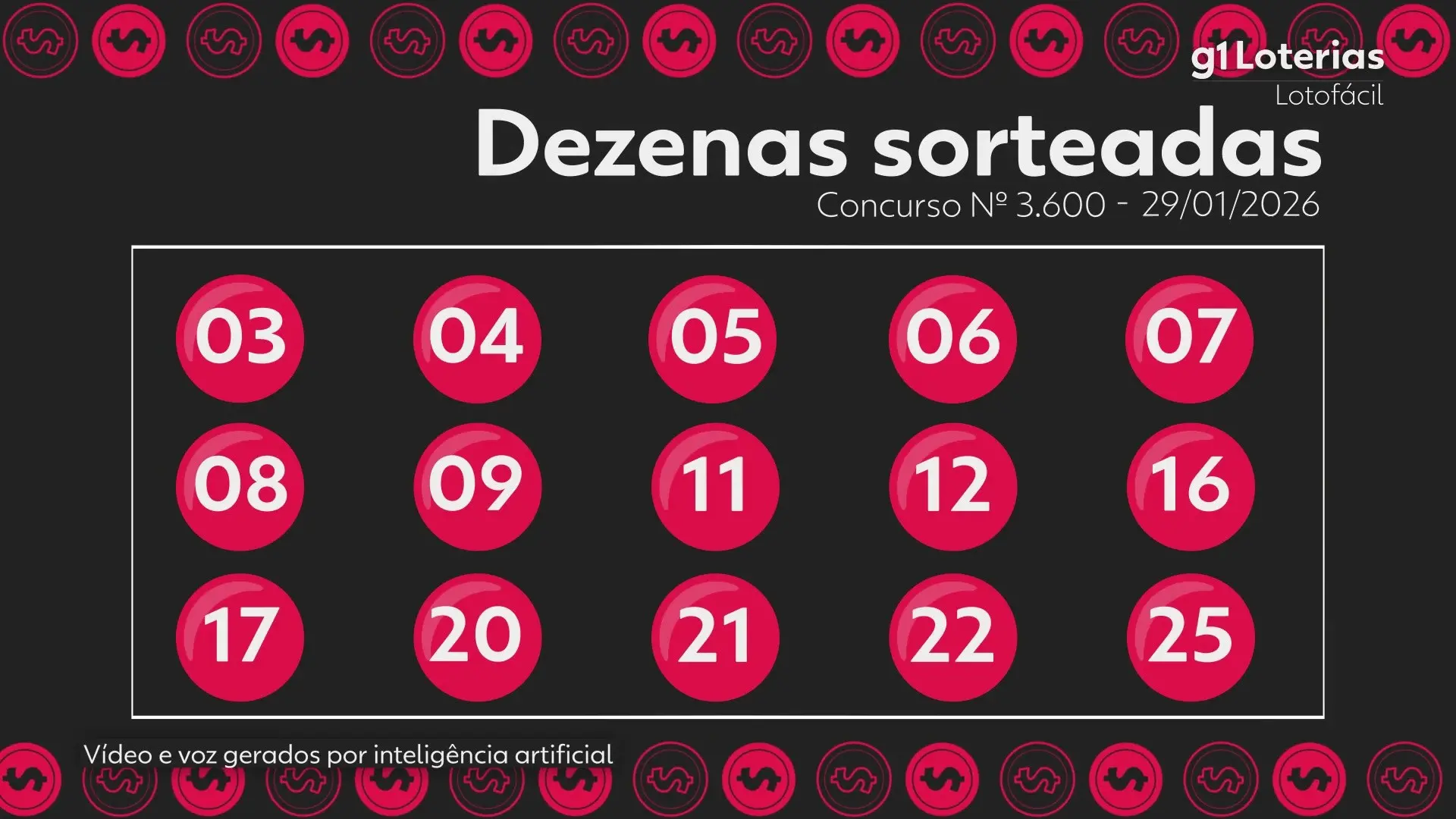 A Lotofácil divulgou os resultados do concurso 3600, realizado na noite desta quinta-feira (29). Os números sorteados foram: 3 – 4 – 5 – 6 – 7 – 8 – 9 – 11 – 12 – 16 – 17 – 20 – 21 – 22 – 25. Três apostas sortudas conseguiram acertar as 15 dezenas, garantindo um prêmio individual de R$ 4.995.383,67 para cada uma. Com esses ganhadores, a Lotofácil não acumulou.